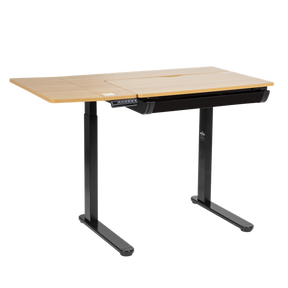 0°-40° Tilting oak effect drafting desktop ideal for your office or home needs, with a digital control panel and four programmable memory presets enabling you to reach your desired height with the push of a button. Ergonomic design helps to reduce the most common complaint of office workers who sit all day. Gives a large working space of (W x D): 1200 x 600mm for office or home. 950mm wide with the side table folded down. Single motor system ensures a fast and stable adjustment. Features ultra-quiet operation with a sound level less than 50dB. Assembly takes less than 30 minutes. Features anti-collision for safety when used around children. Includes handy storage drawer to store your office or home essentials. Height Range: 730-1230mm. Maximum Load Capacity: 50kg.