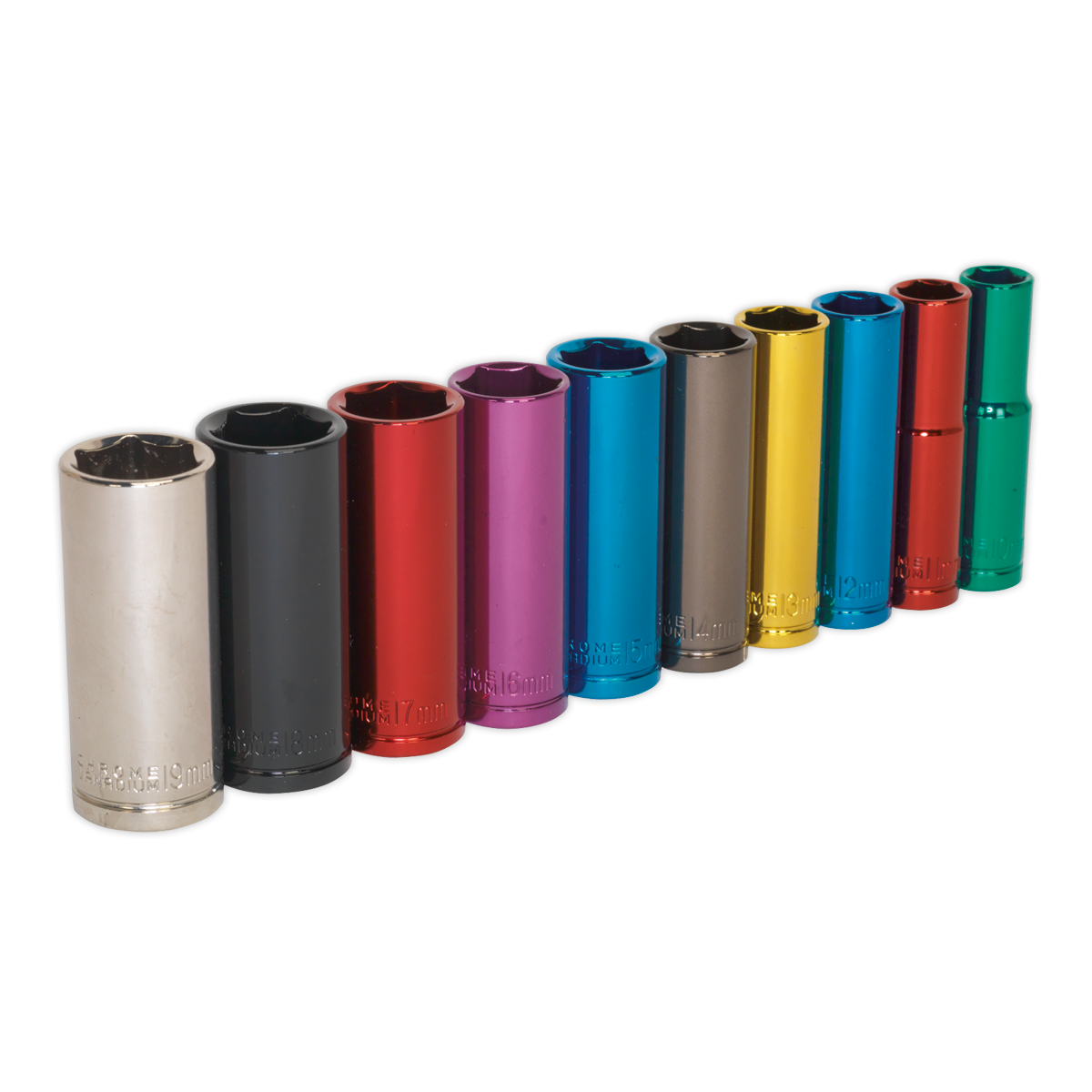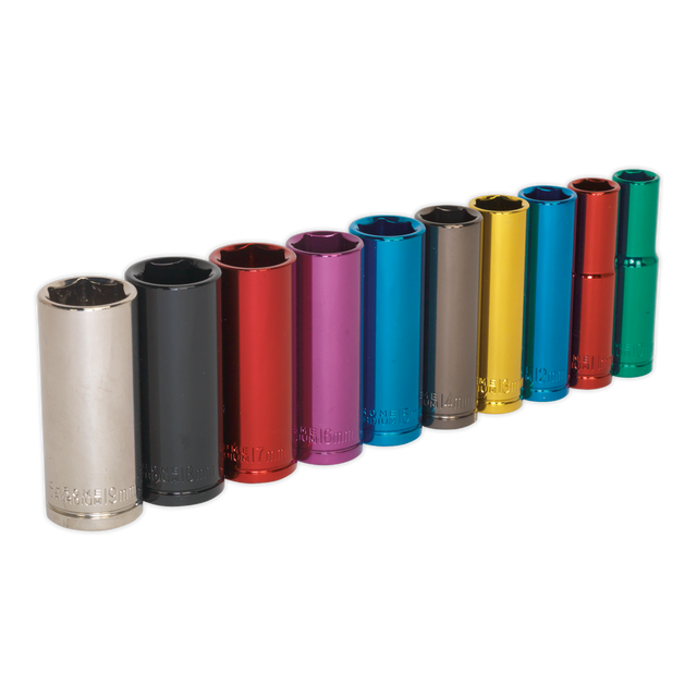 • Multi-coloured Chrome Vanadium steel deep socket set.