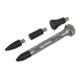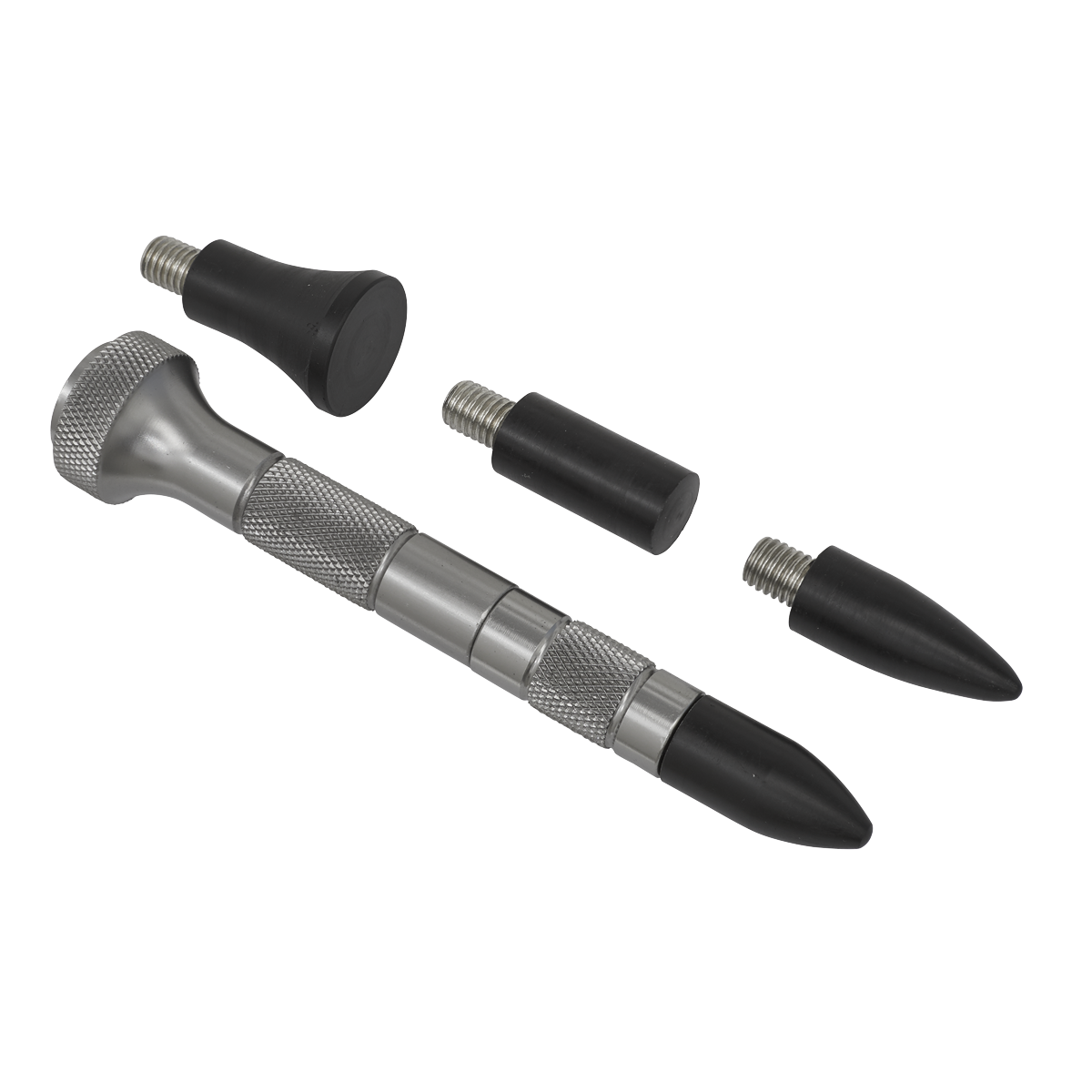 Features four interchangeable heads. The body has an optional extension to take length (including head) from 100mm to 130mm, allowing use in hard-to-reach areas. Ideal PDR (paintless dent repair) tool for high spots and small dents. Heads include; parallel flat, tapered flat and two sized pointed. Knurled finish on tool for precision handling.