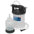 Easy, fast, one-person operation using workshop air supply (90psi). Does not require vehicle-specific reservoir caps. Draws fluid from the bleed screw enabling either bleeding or full replacement of fluid in system. Operation automatically stops when 2L tank is full, preventing spillage. Includes reservoir replenishing bottle, instructions and air line quick connector.