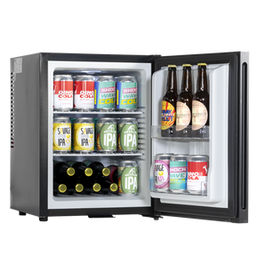 Thermoelectric cooling and heat pipe technology to give a temperature range of 5-15°C. Noise rating of 25dB makes this mini fridge suitable for use in bedrooms, hotel rooms, guesthouses, B&B and the office. 35L Capacity, suitable for wine bottles, beer cans, soft drinks, snack foods & more. Automatic defrost feature fitted to make using this device convenient and simple. Design features removable wire shelves, internal LED light and built in security lock. Fitted with a reversible door and adjustable feet to make it even easier to fit in any space. External Dimensions (W x D x H): 405 x 445 x 545mm. Internal Dimensions (W x D x H): 299 x 261 x 410mm. Net (Useable) Capacity 33L. Annual energy consumption 140 KWh/a.