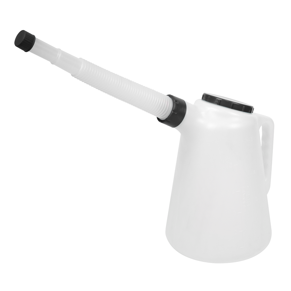 Polyethylene jug resistant to oil and most acids. Removable flexible spout. Screw cap and lid enables jug to be used as a container, to ensure safer handling of liquid, preventing spillages. Scales on these jugs are for indication purposes only and are not intended for 100% accuracy.