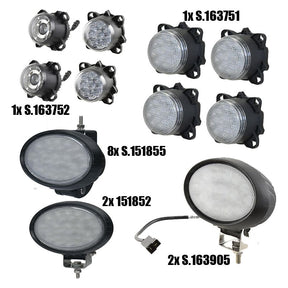 The kit includes 1 x S.163752 and 1 x S.163751 advanced LED lights for high-powered frontal coverage, 8 x S.151855 work lights for wide-beam illumination, 2 x S.151852 auxiliary lights for targeted focus, and 2 x S.163905 lights to complete the lighting system. Each light is built to withstand harsh agricultural conditions, offering high-lumen performance, long service life, and energy efficiency.