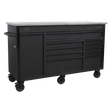 All heavy-duty steel construction and manufactured with steel inner walls for extra strength and durability. Heavy-duty 45mm ball-bearing drawer slides provide superior performance, suitable for heavier loads. Full height rear locking mechanism, locks smooth running soft close drawers in place. Rust and solvent resistant black crinkle effect finish. Fitted with six Ø125mm PP wheels with black chrome effect alloys, two fixed, two swivel and two swivel with brakes. Each drawer features stylish black anodized heavy-duty drawer pulls plus pre-cut non-slip liners. Power tool charging drawer fitted with 4 x 230V sockets and 2 x 5V 2.4A USB sockets. Mounting points to fit additional four gang power strip - Model No. EL34USBB (not included). Stainless steel 'flip-top' split equally into 2-sections providing a work surface and additional storage. Two cylinder locks allow drawers and power tool charging drawer to be locked separately.