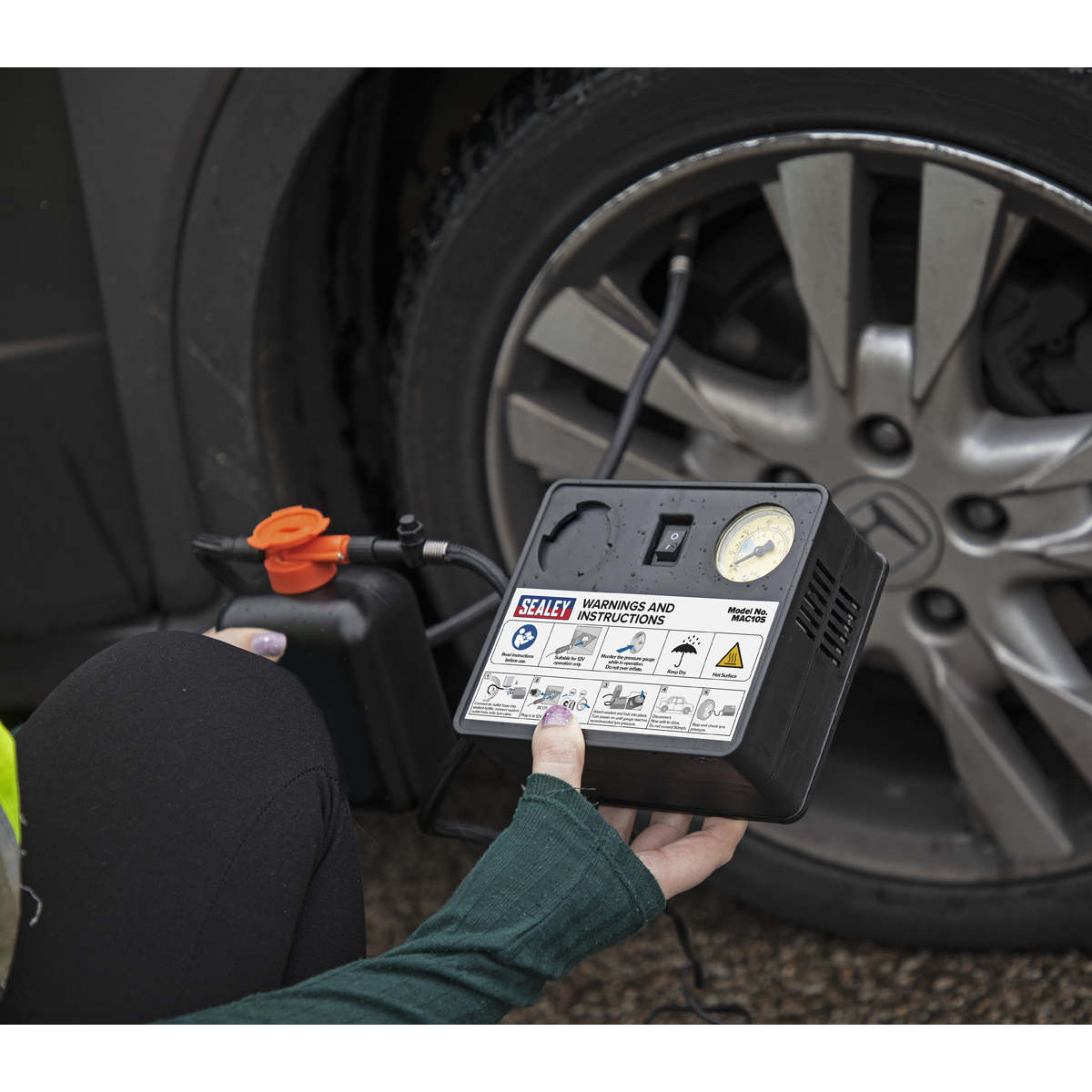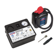 Emergency kit includes 12V compressor, 450ml sealant bottle, accessories for inflatables, instructions and zipped storage bag fitted with hook-and-loop fastening for smart storage. Can seal a puncture up to Ø6mm at the roadside in under 10 minutes. Sealant is manufactured from natural rubber, meaning tyre can be washed out at the point of a professional repair. Very simple-to-use kit requires no tools, no need to remove the valve core and is TPMS safe. Plugs into a 12V vehicle accessory socket. Replacement sealant bottle available - Sealey Model No. MAC10SR. Suitable for cars, vans and 4x4s.