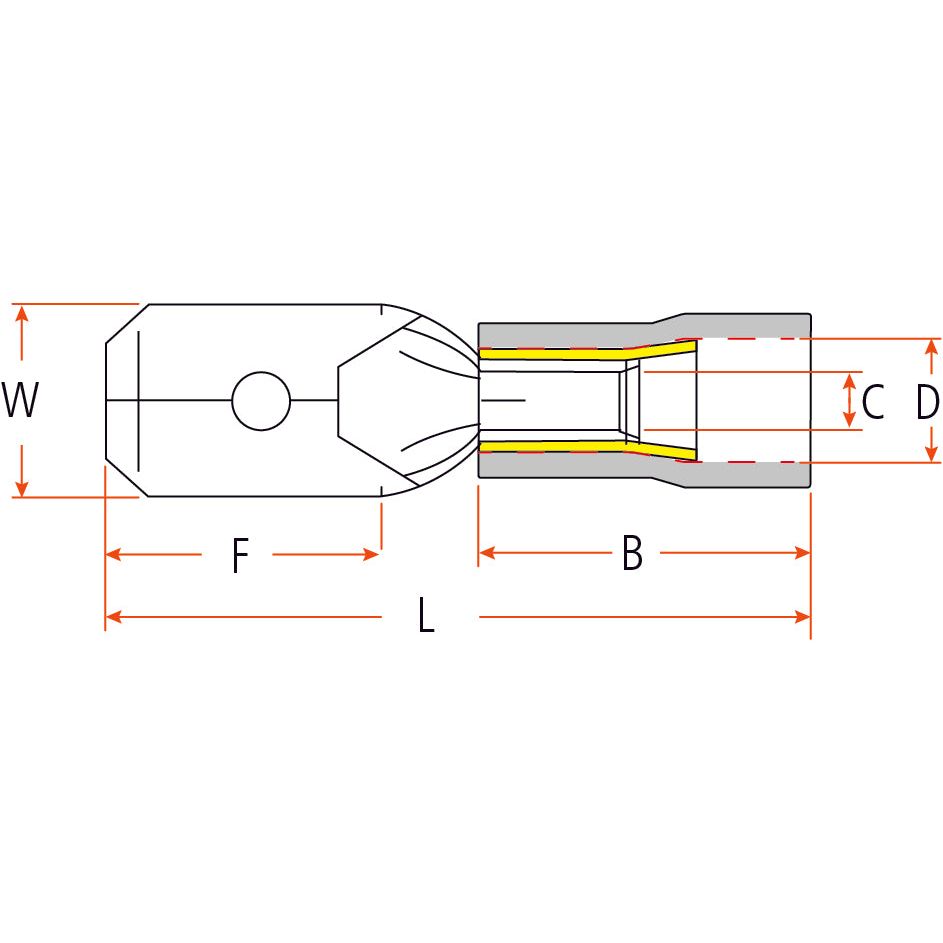 Introducing the Standard Grip Male Spade Terminal, designed for reliable electrical connections. This high-quality terminal features a 6.3mm size and is ideal for wire sizes ranging from 4.0 to 6.0mm². Its vibrant yellow color ensures easy identification, making it a practical choice for various applications.