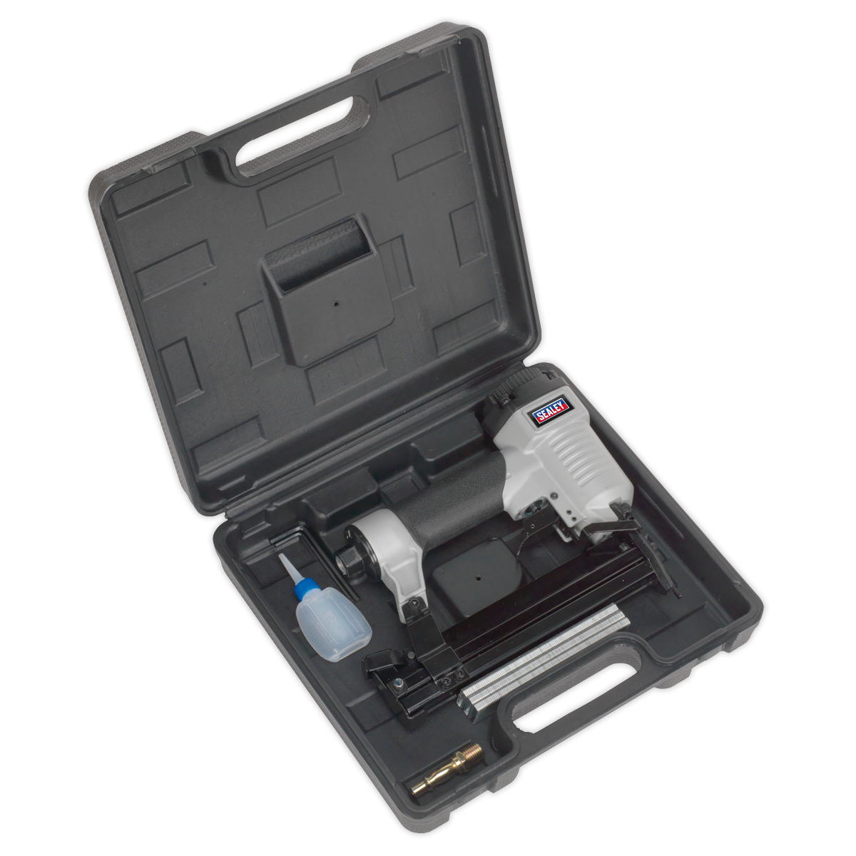 Professional air stapler with lightweight aluminium body and rubber grip handle. Safety trigger device to prevent accidental firing of staples. Supplied in storage case with oiler and starter pack of staples.