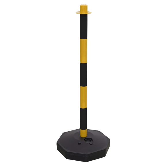 Highly visible Black/Yellow post with base. The base can be filled with dry sand for added stability. Suitable for use with Model No. BYSBKIT for extending the safety barrier when working on hybrid or electric vehicles.