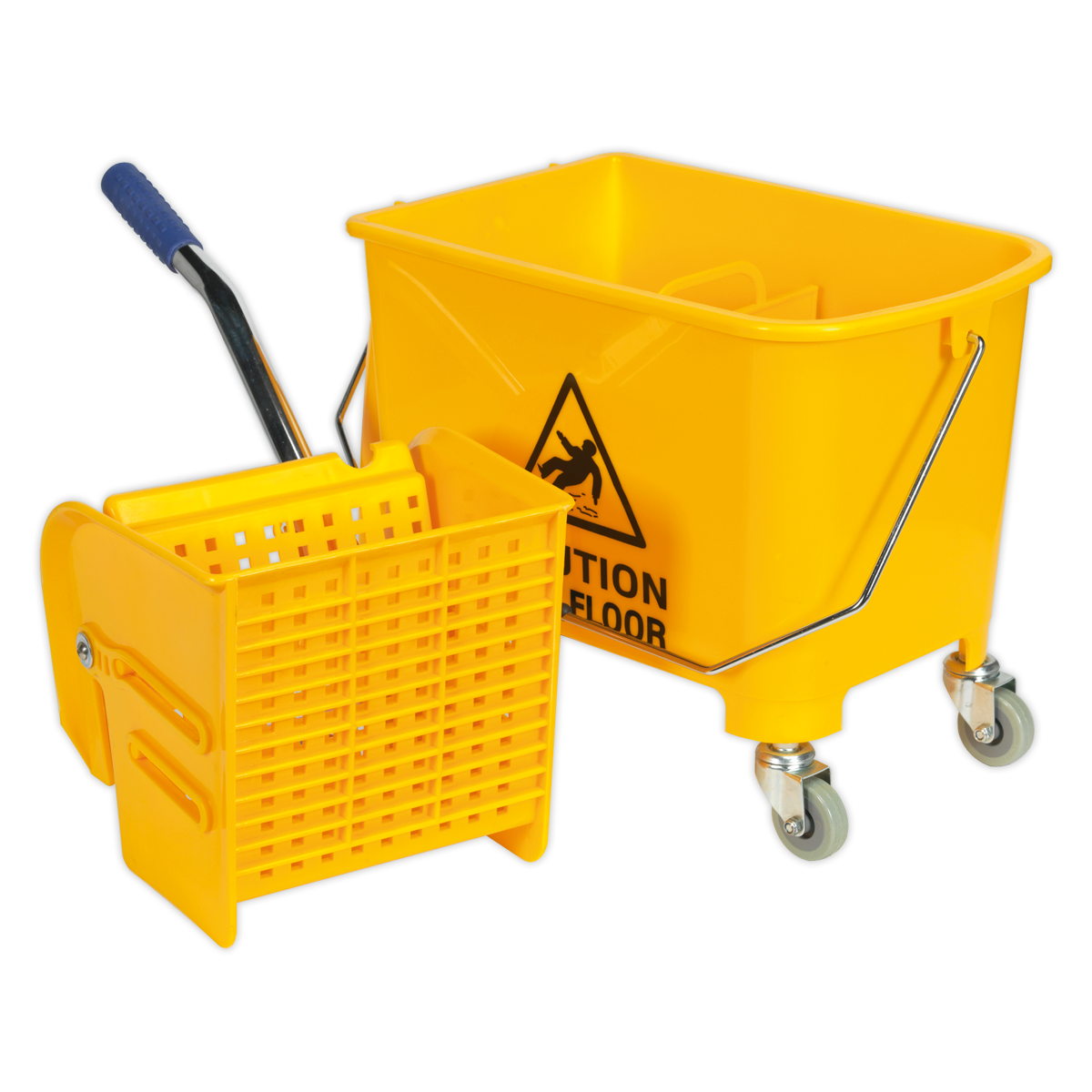 Heavy-duty composite construction with detachable side press wringer and mop holder. Features Ø50mm non-marking castor wheels for added manoeuvrability. Fitted with carry handle.