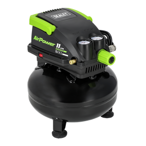 Aluminium cylinder head with cast iron cylinder gives added resistance to wear. Fitted with fully automatic pressure cut-out switch and twin gauges displaying tank and working pressures. Pump head directly coupled to heavy-duty universal motor for reliable and quiet operation. Precision welded receiver tank manufactured to meet Pressure Vessel Directive. The benefits of oil free compressors include: easy maintenance, reduced noise levels, better efficiency, quieter when running and no oil contamination in the air supply. Lightweight unit with carry handle and built-in cable tidy for easy manoeuvrability.