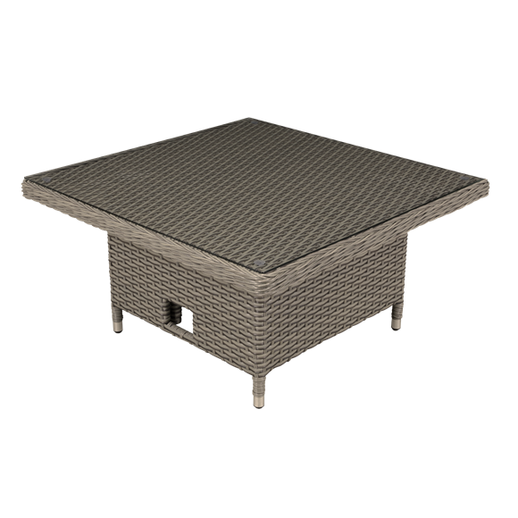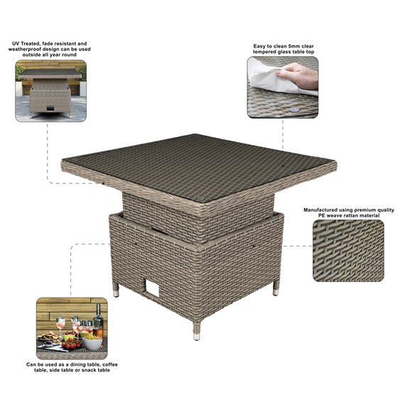 This modern rattan dining table will work in any outdoor space from large gardens to small patios and balconies. Table is easily adjusted to transform into a dining table. Two Height Settings (Low/High): 46cm/68cm. This easy-to-clean tempered glass tabletop has been UV Treated, is fade resistant and can be used outside all year round. Can be used as a dining table, side table, snack table or coffee table. Dimensions (W x D x H) – 90 x 90 x 46-68cm.