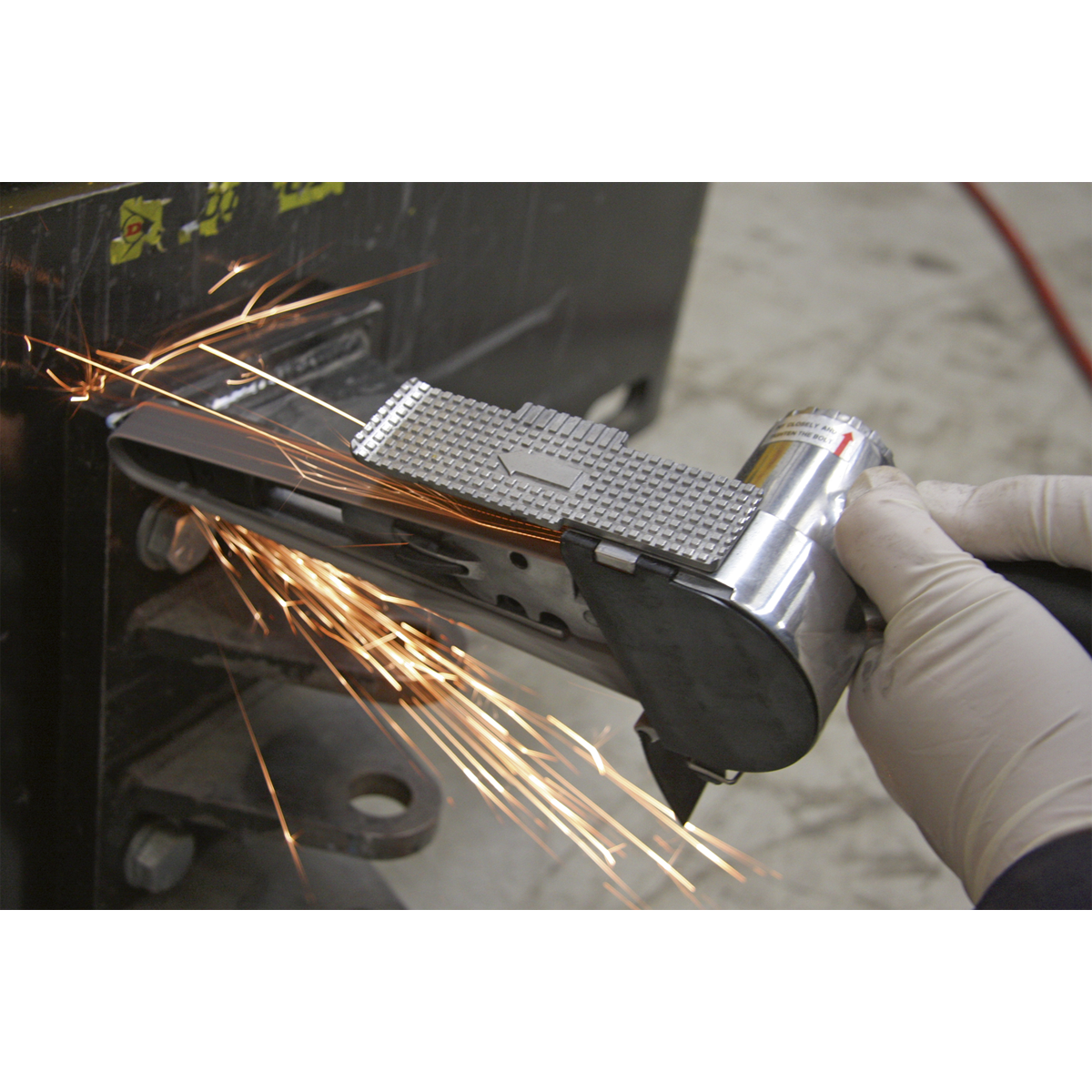 Aluminium housing with articulated sanding arm. Features belt tracking control, heavy-duty nose roller and one-handed trigger operation. Composite handle with exhaust reduces chill and noise level. Suitable for sanding otherwise inaccessible areas such as around door shuts. Extra width of belt makes tool suitable for welding work too. Replacement belts readily available, see XXX.