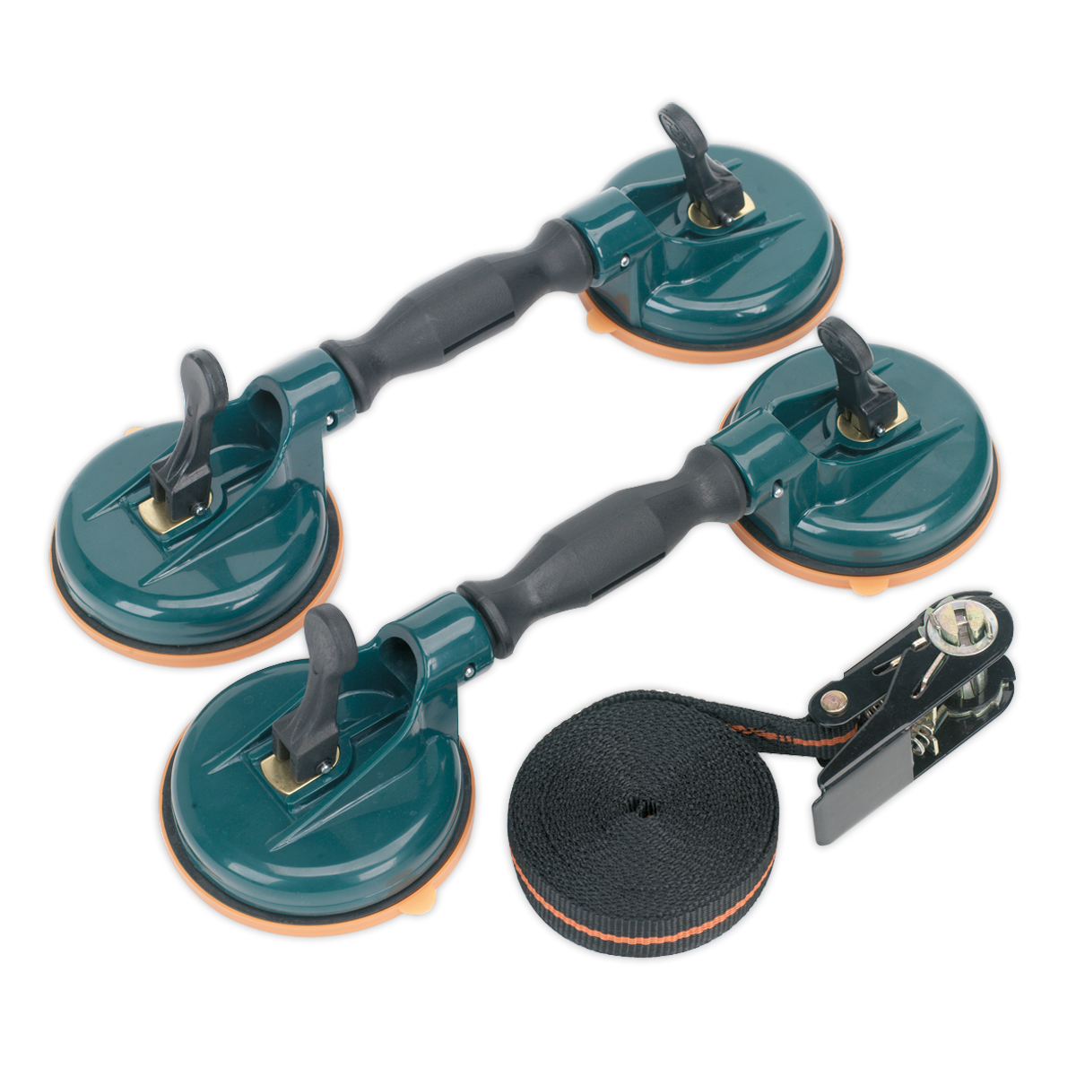 Two glass-reinforced plastic gripper handles with four Ø115mm lever operated suction pads. Powerful suction will handle 60kg of windscreen. Supplied with ratchet tie down to fix screen in position if required.