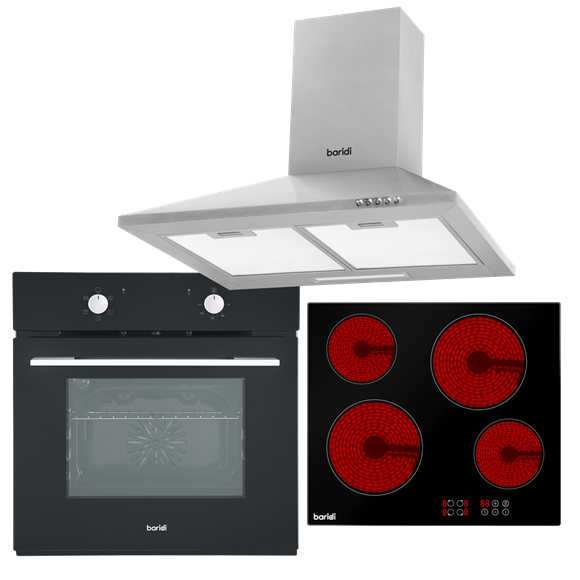 The large 55L capacity and consistent oven temperatures will help you cook perfect meals for the whole family. The oven features five functions: Grill, Bottom Heating, Conventional - Top and Bottom Heating, Defrost & ECO modes. Higher efficiency means less noise and a more powerful fan without higher electricity bills. 65 Watts of power with 350m³/h of suction is enough to freshen your kitchen and keep cooking fumes out of the rest of your house. With three fan speeds, you're in control. The hob features two 1800W and two 1200W heating elements each independently controllable with nine power settings. Intuitive touch controls have a safety lock to prevent children and pets from accidentally activating the hob. Suitable for all types of cookware, from cast iron and aluminium pans to ceramic and tempered glass dishes.