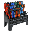 Selection of popular sized screwdrivers, nut drivers, bit driver and 60 bits. Chrome Vanadium steel satin finish shafts with shot blasted and magnetized tips. Contoured soft grip handles with colour-coding for fast identification. Supplied with wall mountable display stand which features a built-in magnetizer/demagnetizer.
