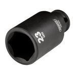 These Draper Hi-TORQ® 6-point deep impact sockets are forged from hardened chrome molybdenum steel. Black phosphate finish for corrosion protection. For use with electric or pneumatic impact wrenches with a 3/8" drive.