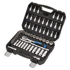 This socket and bit set is made from chrome vanadium steel with a satin chrome finish. It includes a wide range of 3/8" Sq. Dr. 6-point HI-TORQ® sockets and deep sockets. The 72-tooth quick release ratchet is equipped with a soft grip handle for comfort. There is an array of socket bits made from chrome vanadium steel with a shot blasted finish. Additionally, the set includes extension bars (75, 250mm), spark plug sockets (16, 21mm), a 1/2" Sq. Dr. (F) to 3/8" Sq. Dr. (M) 3-way adaptor and universal joint. All of these items are supplied inside a sturdy plastic storage case.