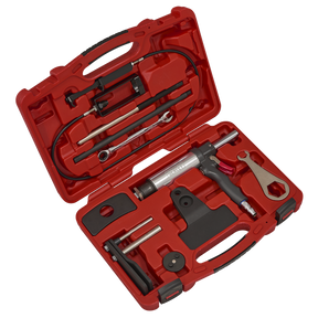 Used for pushing back brake pistons and removal/installation of hose clips. Pneumatic wind-back tool is suitable for left or right-hand wind-back operations. Suitable for push-back and wind-back brake pistons. Long-reach flexible cable, designed to reach awkward-positioned hose clips. Kit includes a 2-pin magnetic adaptor for use with interchangeable brake adaptor plates, thrust pin, one and two brake piston spreaders, thrust bolt, 10mm ratchet spanner, locking nut spanner and hose clip attachment. Supplied in a storage case.