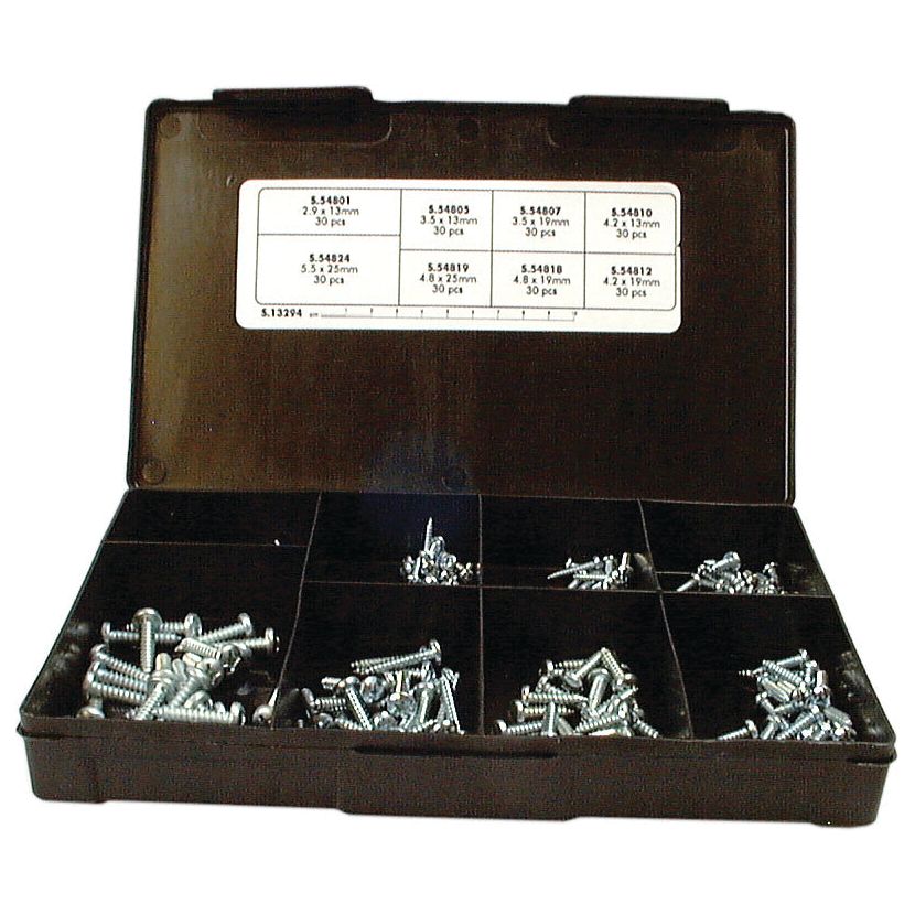 Contains: 30 x S.54801 Metric Self Tapping Pozidrive Screw, Size: M2.9 x 13mm (Din 7981B) 30 x S.54805 Metric Self Tapping Pozidrive Screw, Size: M3.5 x 13mm (Din 7981B) 30 x S.54807 Metric Self Tapping Pozidrive Screw, Size: M3.5 x 19mm (Din 7981B) 30 x S.54810 Metric Self Tapping Pozidrive Screw, Size: M4.2 x 13mm (Din 7981B) 30 x S.54812 Metric Self Tapping Pozidrive Screw, Size: M4.2 x 19mm (Din 7981B) 30 x S.54818 Metric Self Tapping Pozidrive Screw, Size: M4.8 x 19mm (Din 7981B) 30 x S.54819 Metric Self Tapping Pozidrive Screw, Size: M4.8 x 25mm (Din 7981B) 30 x S.54824 Metric Self Tapping Pozidrive Screw, Size: M5.5 x 25mm (Din 7981B)