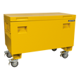 Manufactured from heavy gauge steel with seam welded joints. Folded lips add strength and rigidity. Box may be secured with a padlock hidden in recess at the front. Tamperproof locking system protects padlock for extra security. Features industrial strength handles on each side of box for manoeuvrability. Lid features gas support strut for easy-opening. Fitted with welded feet allowing unit to be moved by forklift. Supplied with castors. Suitable for secure storage of tools and heavy equipment on site, vehicle, in the workshop or at home.