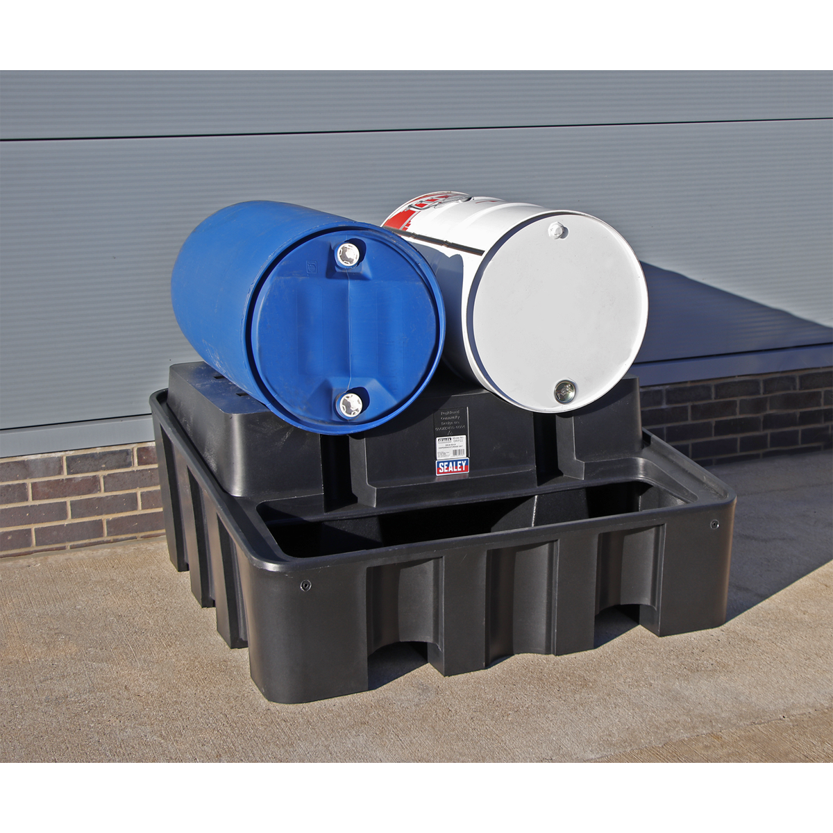 High-density polyethylene construction, suitable for storing 2 x 205L drums. Moulded with gradual decline and recesses to secure drum. Horizontal storage of drums provides access to dispense contents into smaller containers. Fitted with 450L spill tray ideal for catching and preventing spillages. Can be easily moved by forklifts and pallet trucks.