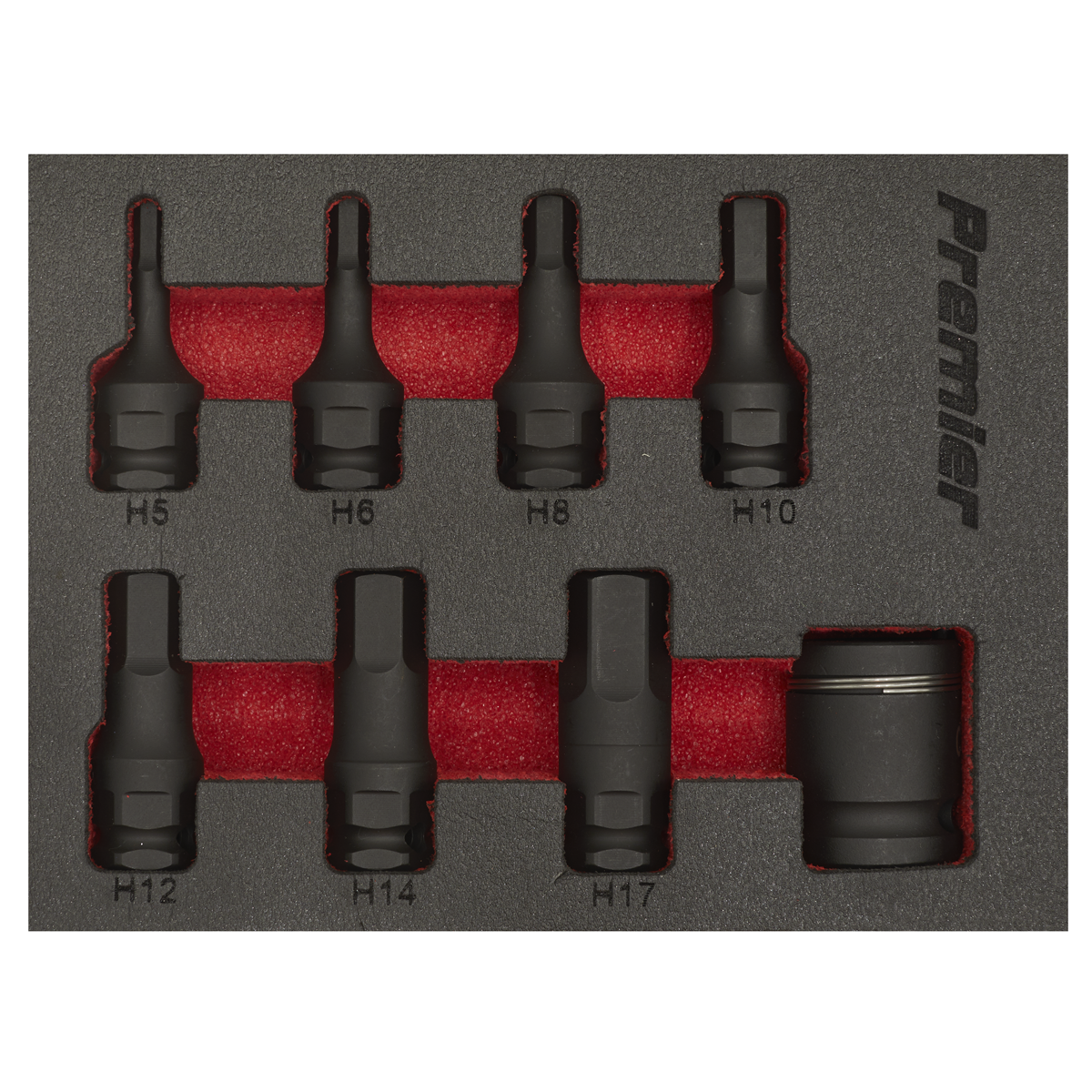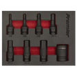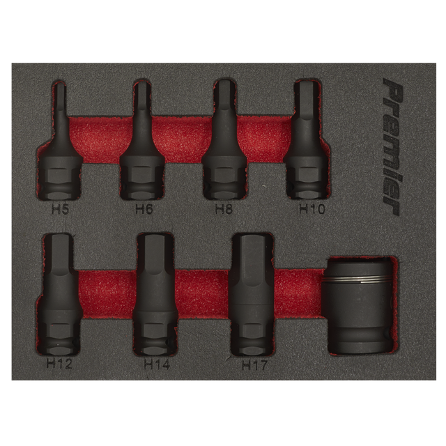 Manufactured from hardened and tempered Chrome Molybdenum steel with a manganese phosphate finish for resistance to corrosion. 3/8"Sq drive impact hex socket bits with an additional locking 1/2"Sq drive quick change adaptor. Supplied in an EVA storage tray.