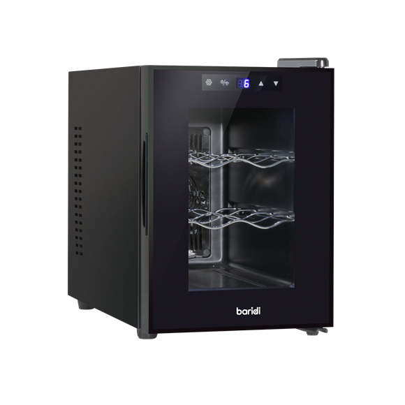 Wine cooler with advanced thermoelectric cooling technology and a versatile temperature range of 5-18°C (41-64°F), controlled by touchscreen controls. Operates quietly and efficiently, consuming less energy compared to traditional compressor-based models. Perfect for small apartments, kitchens, or countertop use. Featuring a digital temperature display and intuitive controls. Glass door allows you to showcase your wine collection while protecting it from harmful UV rays. Size (W x D x H): 26.5 x 51.5 x 39.5cm.
