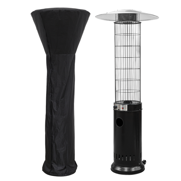 Standing at 2.1m tall, when lit the heater produces a real flame encompassed by a glass tube and heats the surrounding area up to 8m², with a metal reflector ensuring heat is directed downwards and outwards. Ideal for both commercial and domestic settings including restaurant and pub gardens, open workshops, boat yards, patios, forecourts and terraces. Variable heat output controls make it fully adjustable. Features a fully enclosed gas cylinder chamber and safety tip-over switch. Product Dimensions (W x H): 810 x 2110mm. Maximum Gas Bottle Size (W x H): Ø325 x 690mm. Supplied with water resistant cover, 27mm regulator and hose assembly for use with propane patio gas bottles.