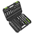 Contents: 1/4"Sq Drive Standard Sockets; 4-14mm, 1/4"Sq Drive Deep Sockets; 6-13mm, 1/4"Sq Drive Socket Bits; T8-T30, Phillips - #1, #2, Pozi - #1,#2, Slotted - 4-7mm, Hex - 3-6mm, 1/4"Sq Drive Extension Bars; 50, 100mm, 1/4" Drive Flexible Extension, 1/4"Sq Drive Ratchet Wrench, 1/2"Sq Drive Standard Sockets; 10-32mm, 1/2"Sq Drive Deep Sockets; 14-19mm, 8mm Hex Bits; TRX-Star* - T40-T55, Phillips - #3, #4, Pozi - #3, #4, Slotted - 8-12mm, Hex - 8-14mm, 1/2"Sq Drive Spark Plug Sockets; 16, 21mm, 1/2"Sq Drive Extension Bars; 125, 250mm, 1/2"Sq Drive Ratchet Wrench, 1/4" and 1/2"Sq Drive Universal Joints, 1/4"Sq Drive Spinner Handle, 1/4"Sq Drive Sliding T-Bar, 1/2"Sq Drive T-Bar Adaptor, 8mm Hex Bit Adaptor, Hex Keys; 1.5-2.5mm.