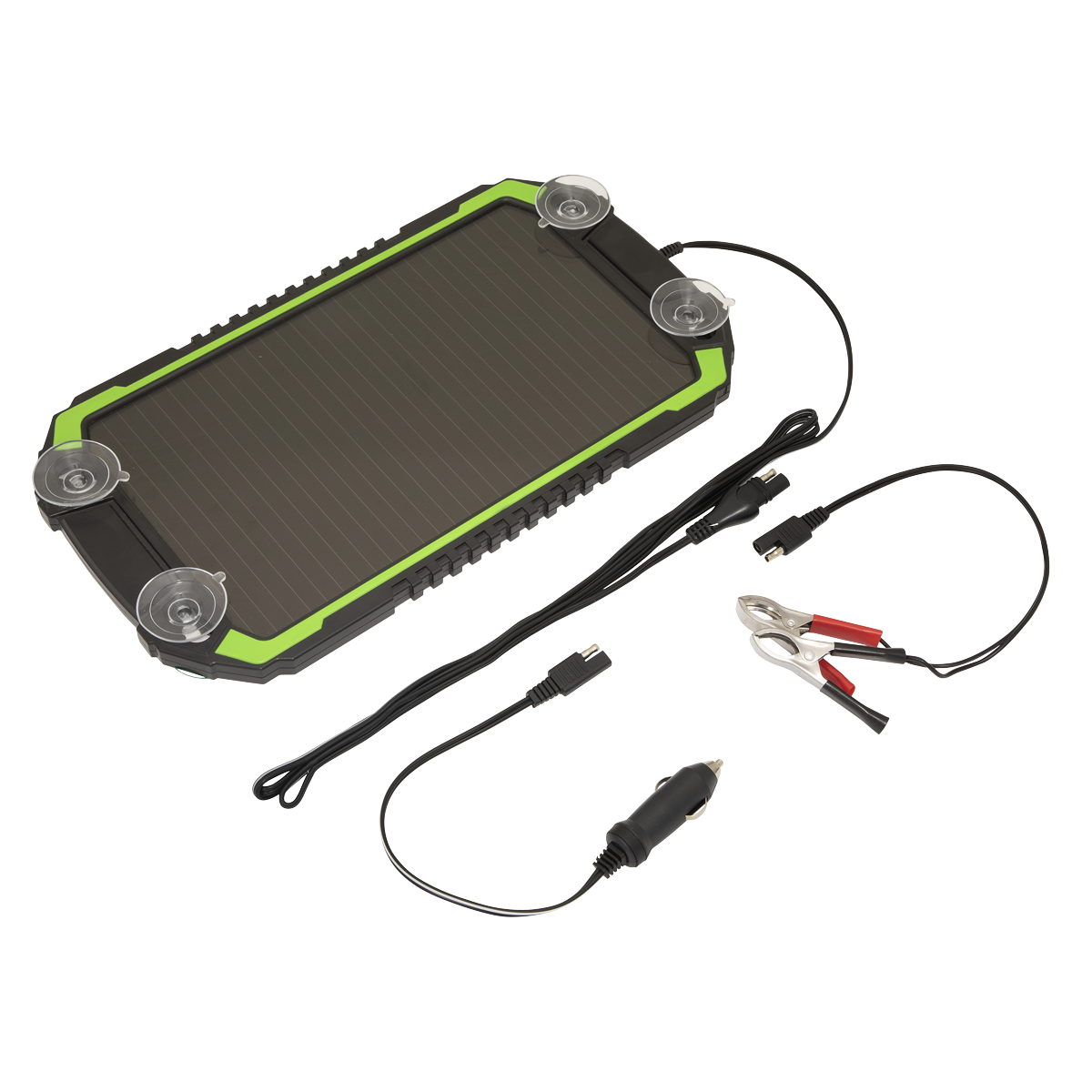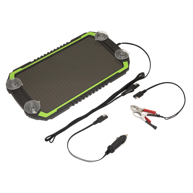 Amorphous solar panel converts daylight directly into 12V electricity. Suitable for maintaining charge in a wide range of batteries and power packs. Ideal for batteries stored in boats and caravans and for batteries in vehicles in long-term storage. IP44 Rating (non-waterproof). For use behind car windscreen or other protection. Supplied with suction pad fixings, battery clips and vehicle accessory socket plug (only suitable for vehicles with “permanent live” accessory socket).