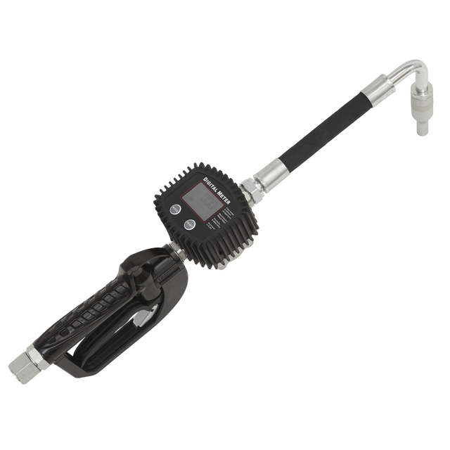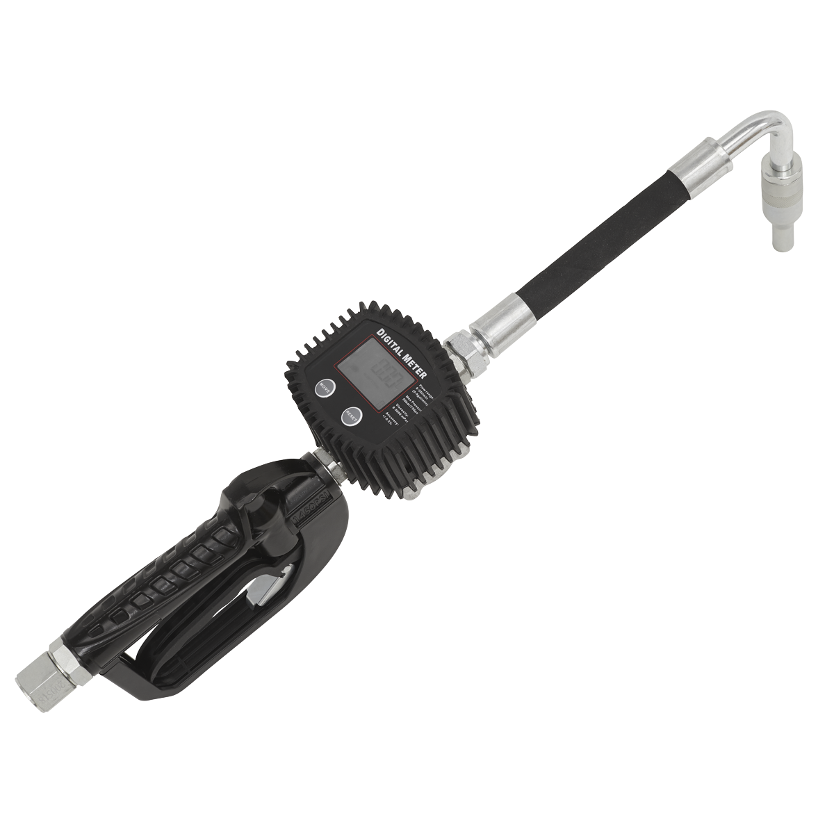 Robust oil dispensing gun incorporating digital meter, manual shut-off and tough rubber protection guard. Fitted with flexible extension and non-drip nozzle. Easy-to-read 5-digit LCD display with resettable individual or cumulative totals.