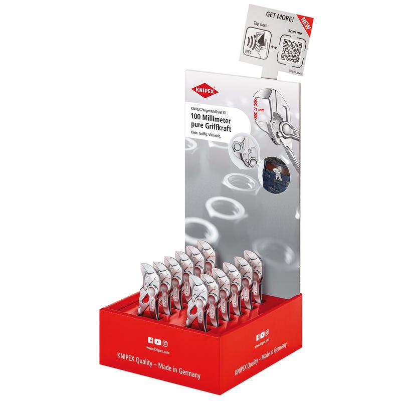 00 18 01 V42 Counter Display New products in the spotlight. Variable. Compact. High selling Display of high-quality cardboard with high gloss print. Small size, minimum space required at the point of sales. Big impact in a small space. For spontaneous purchases, e.g. in the checkout area. Now with NFC tag: Simply retrieve further information with your smartphone. Reversible header: Information in German, English, French, Spanish. Content: 12 x 86 04 100 KNIPEX Pliers Wrench XS pliers and a wrench in a single tool (100 mm),