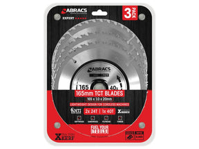 Abracs 3pc TCT 165mm Cordless for Wood contains 2x 24T & 1x 40T Blades for Rip & General Purpose cutting applications.