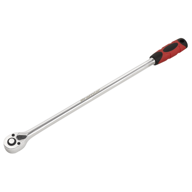 Hardened and tempered Chrome Vanadium steel ratchet wrench with a fully polished mirror finish. Ultra-smooth 72-tooth pear-head ratchet and soft grip handle for added comfort and control. Extra-long shaft improves access for hard-to-reach applications. Features flip reverse and spring-ball socket retention.
