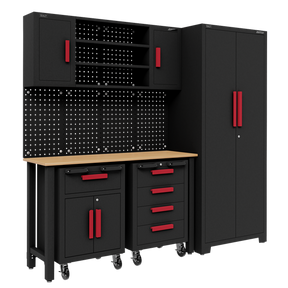 Complete your garage or workshop with this stylish complete garage storage solution. All units are powder coated to protect against scratches, mild solvents and general workshop use. Fully welded units offer a strong and professional finish conveniently packed and delivered in one tidy pallet. Pegboard design wall panels allow for additional storage whilst protecting the wall behind the workbench. Some simple assembly is required.