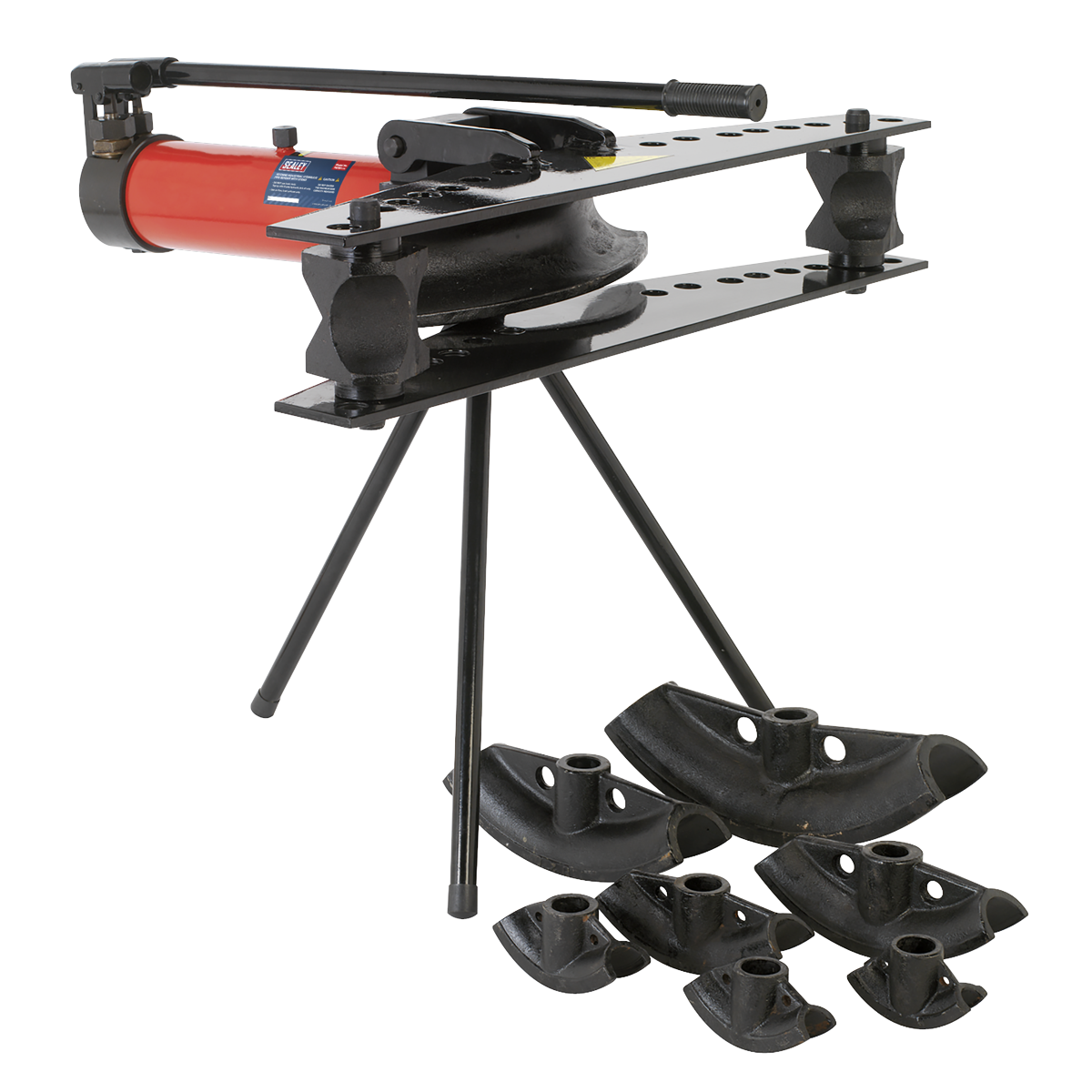 Tripod mounted pipe bender suitable for bending pipes up to 180°. Integral 15 Tonne ram. Suitable for bending DIN classified medium and heavy pipe. 2-Speed hydraulic pump gives fast pipe positioning and the power to bend 75mm pipe. Supplied with eight (15mm(1/2") - 75mm(3") interchangeable pipe dies and packed in a heavy wooden crate for easy transportation.