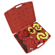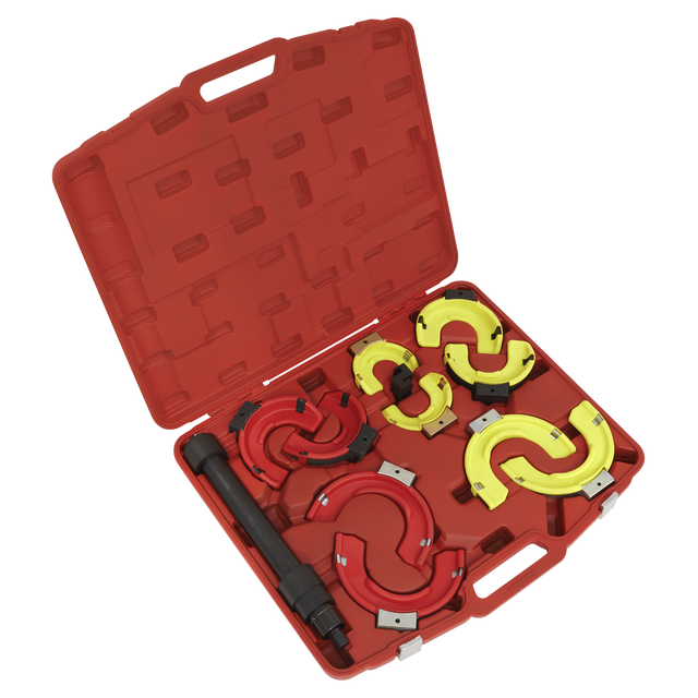 Suitable for MacPherson strut coil springs. Supplied with five pairs of different sized interchangeable yokes, for right and left-handed coil springs. Plastic yoke protectors that protect the spring coating from damage, which can invalidate the vehicle manufacturer's guarantee. Safety yokes carefully shaped to stop the spring bowing while under compression.