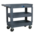 Heavy-duty garage and workshop trolley with a huge 83kg capacity per shelf. Manufactured from extra-strong impact resistant plastic. Ideal for a wide variety of applications. Features deep wall shelves and tool storage compartments built into the contoured handle. Fitted with four large rubber wheels, two fixed and two swivel castors.