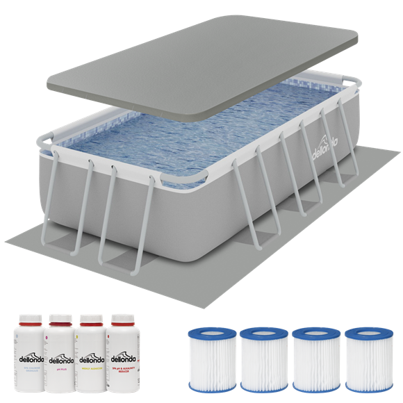 • ACCESSORIES INCLUDED - Supplied with 530gal/hr filter pump, ladder, repair kit, Filter Cartridges, Test Strips, Swimming Pool Chemical Kit, Top Cover & Ground Sheet.