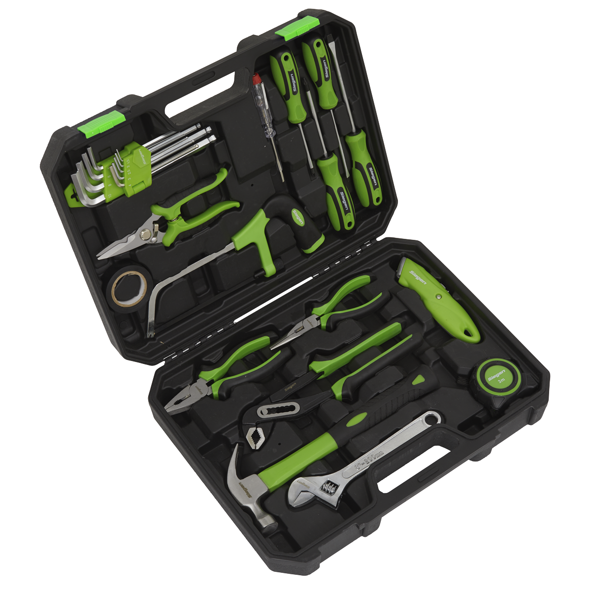 Kit includes slotted and Pozi screwdrivers with Chrome Vanadium steel shafts and soft grip handles. Combination pliers, long nose pliers and water pump pliers with soft grip handles. 8oz Claw hammer with fibreglass shaft. Junior hacksaw, universal shears and retractable snap-off knife. Ball-end hex key set and adjustable wrench. Mains tester, tape measure and insulating tape also included. Supplied in storage case.