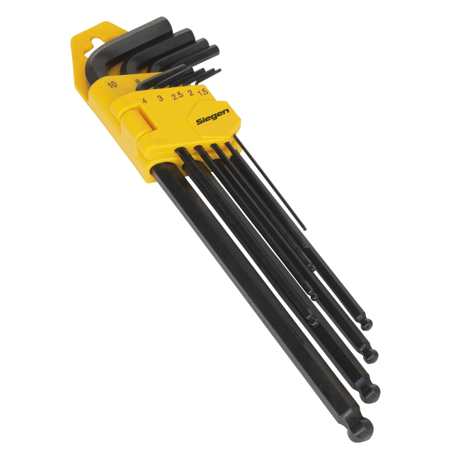 Manufactured from heat treated and hardened Chrome Vanadium steel with a blackened finish. Keys range in length from 90mm to 230mm and in size from 1.5mm to 10mm. Ball-end allows key to drive fixing at up to 30°. Supplied in easy-access case with hanging tag for safe storage and quick key selection.
