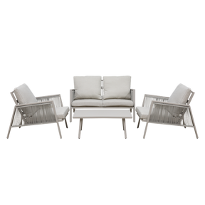Manufactured using powder coated rustproof aluminium. Contemporary design with 8mm round weatherproof Textilene® rope. Supplied with 8cm thick seat and back cushions. Set includes 2-seater sofa, 2 x armchair and aluminium table. Some simple assembly is required. Disclaimer: Colours may slightly vary due to lighting conditions.