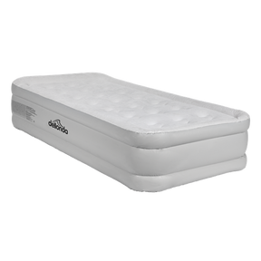 This high raised single air bed with removal 230V electric pump offers an effortless and quick way to inflate and deflate the mattress. This air bed is designed with elevated heights, making it easier to get in and out of bed. The increased distance from the ground provides a more comfortable sleeping experience, resembling the height of a traditional bed. With a soft flocked surface and made of a strong coil beam construction this air bed is made for comfort and durability. Despite its size when inflated, this air bed is compact and easy to store when deflated. This portability makes it a great option for dry/covered camping such as in camper vans, accommodating guests, or serving as a temporary bedding solution. Constructed from heavy duty vinyl with a flocked surface and coil beam construction this airbed provides great support and longevity.