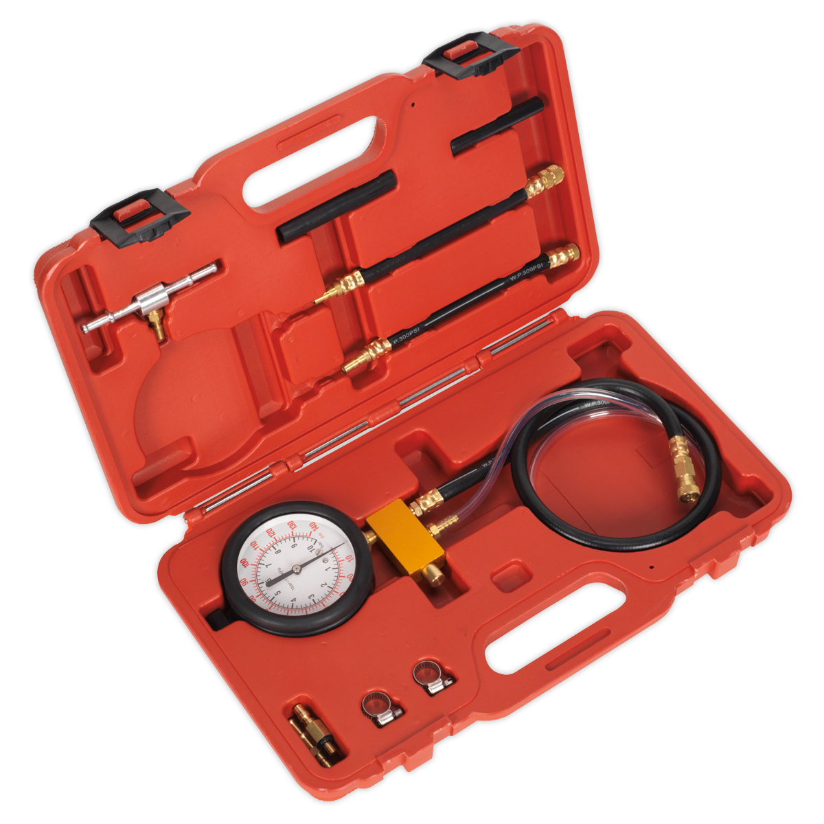 Comprehensive kit of adaptors and fittings for modern Schrader test port fuel injection systems. Components fitted with quick coupling system and safety valve to prevent inadvertent discharge of fuel under pressure. Supplied with large high pressure gauge reading 0-145psi and 0-1000kPa. Gauge has hanging hook and protective bumper. Pressure release valve fitted with long drain hose allows safe recovery of fuel. Supplied in storage case.
