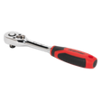 Chrome Vanadium steel 48-tooth gear-to-gear ratchet wrench, hardened and tempered, with a fully polished mirror finish. Features pear-head with flip reverse, push-button quick release and dual material handle with anti-slip comfort grip.