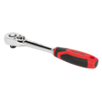 Chrome Vanadium steel 48-tooth gear-to-gear ratchet wrench, hardened and tempered, with a fully polished mirror finish. Features pear-head with flip reverse, push-button quick release and dual material handle with anti-slip comfort grip.