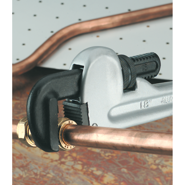European pattern pipe wrench. Gravity cast aluminium alloy handle has the strength of steel but at two thirds the weight. Drop-forged high carbon steel jaws with tool steel spring.
