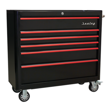 Rollcab 6 Drawer Wide Retro Style - Black with Red Anodised Drawer Pulls - AP41206BR