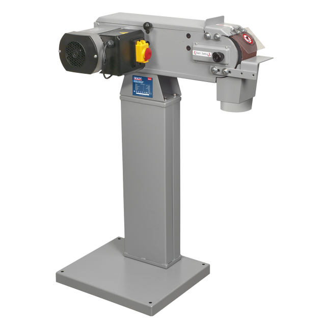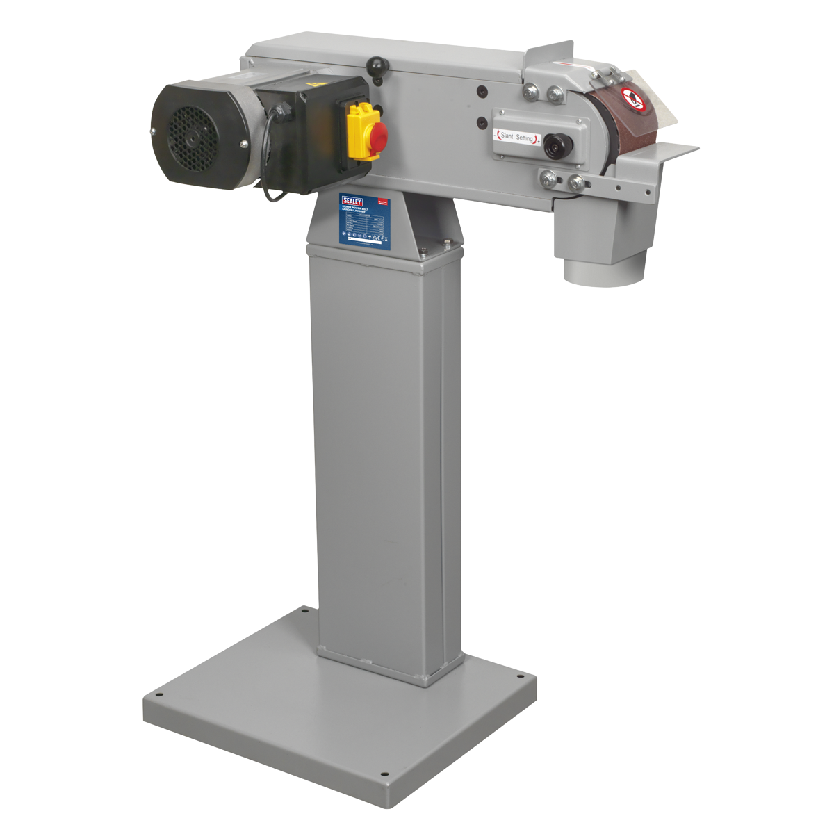 Suitable for metal and fabrication workshops. Robust construction designed for everyday use. Supplied with high quality abrasive belt. Graphite plate on the platen to reduce belt friction. Powerful 1500W 230V motor with IP54 protection. No-volt release switch fitted to aid safe operation. Bench or floor mounting (stand supplied).
