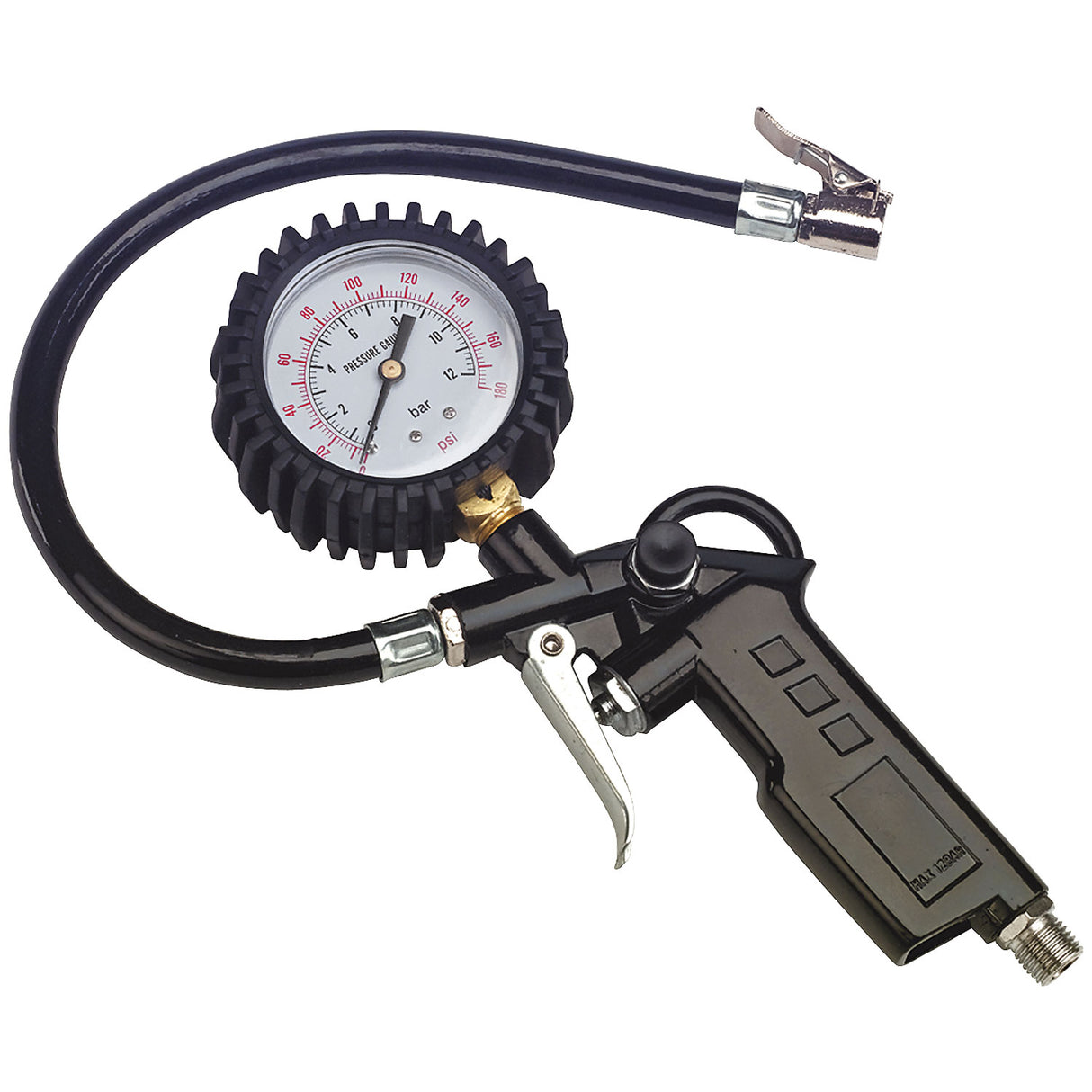 With a maximum operating pressure of 116psi (8 bar), the inflator features a heavy-duty flexible hose for easy positioning and access, and a pressure gauge protected by a rugged rubber casing to prevent damage during tough use. A 1/4" BSP male inlet ensures compatibility with standard air compressor systems.